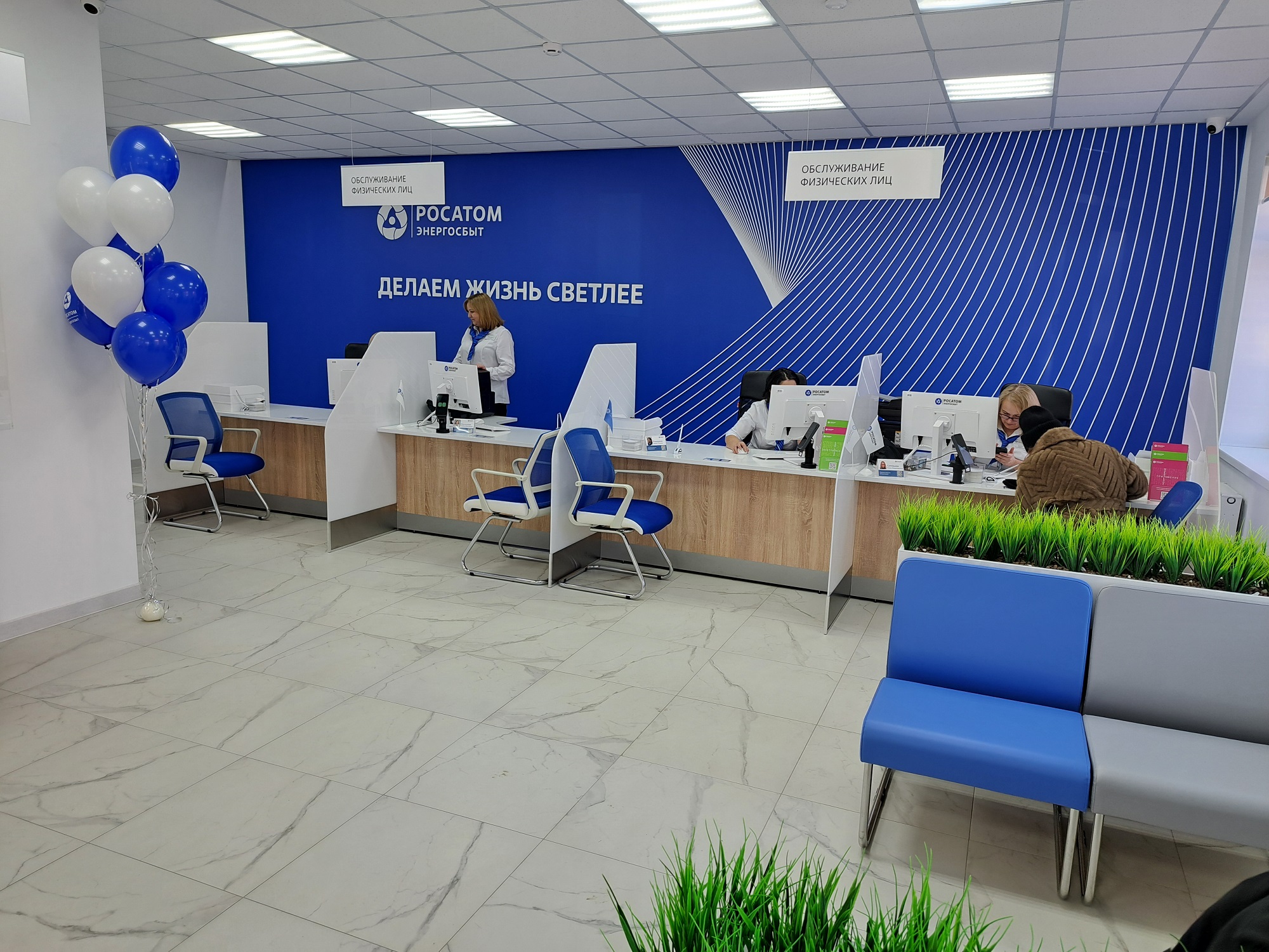 Само помещение оформлено в соответствии со всеми требованиями Госкорпорации «Росатом». Здесь созданы максимально комфортные условия для клиентов - организована зона для ожидания, а для посетителей с детьми оборудован детский уголок. Дополнительно в рамках проекта корпоративной библиотеки филиала установлена книжная полка.